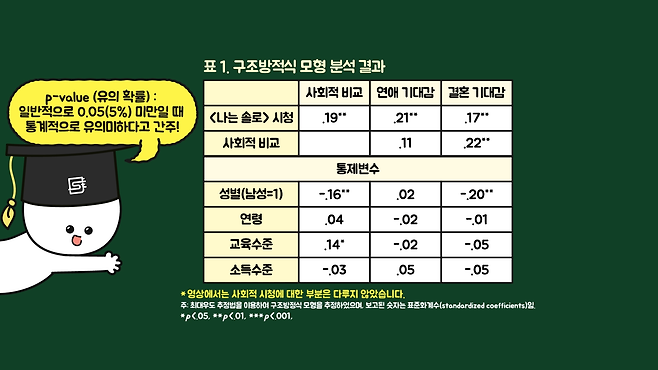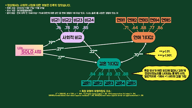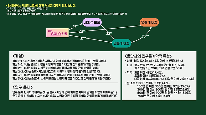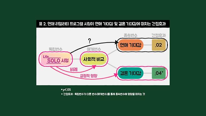 따라서 <나는 솔로> 시청은 사회적 비교(β = .19, p < .01)에 긍정적인 영향을 주고, 연애(β = .21, p < .01)와 결혼(β = .17, p < .01)에 대한 기대감에도 긍정적인 영향을 주는 것으로 확인됩니다.