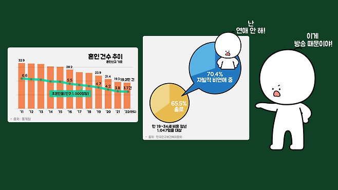 그래서일까요? 우리나라 혼인 건수는 매년 최저치를 경신하고 있고, 비혼 및 비연애 주의자도 늘어나고 있습니다. 일각에서는 연애 리얼리티 프로그램의 인기 때문이라고 주장하기도 하는데, 실제로는 어떤 영향이 있을까요?