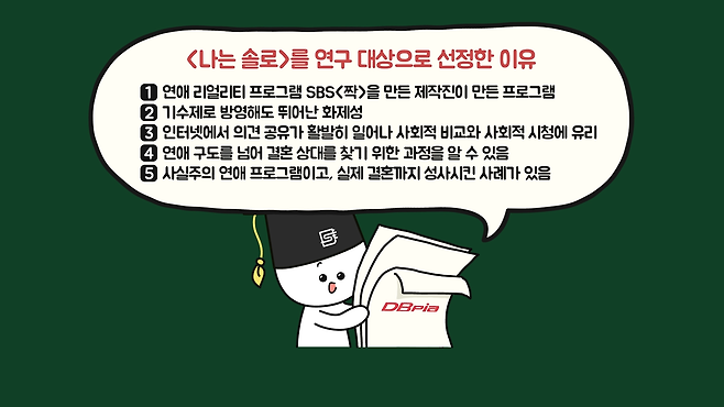 이와 관련한 논문이 있습니다. 여러 연애 리얼리티 프로그램 중 <나는 솔로>를 연구 대상으로 선정해서 분석했고, 선정 이유는 아래와 같습니다.