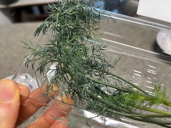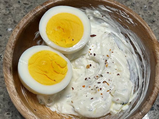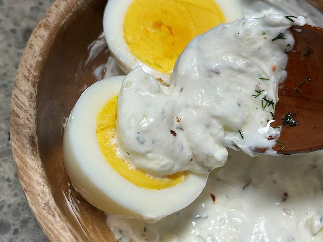 그릭요거트를 그냥 계란과 먹으면 너무 꾸덕하고 자칫 느끼할 수 있습니다. 그래서 양념을 넣고 소스를 만드는 것이 좋은데요. 허브 중 "딜"을 살짝 다져 넣으면 계란의 미세한 비린맛이나 요거트의 진한 유제품 향을 깔끔하게 잡아줍니다.