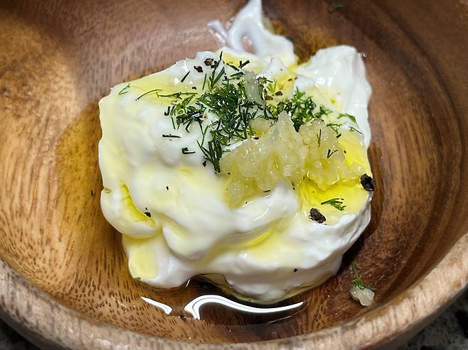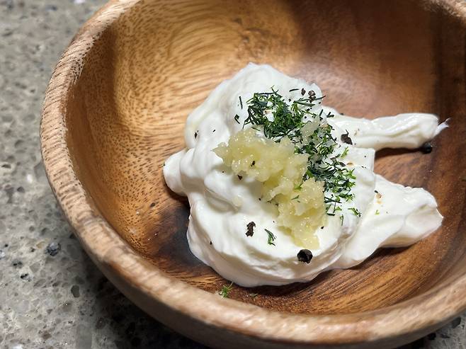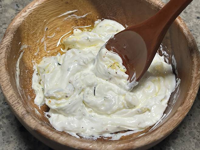 딜과 마늘을 넣어 느끼함을 잡고, 다른 조미료들이 들어가 그릭요거트 단독으로 먹었을 때보다 훨씬 풍부한 풍미를 냅니다. 잘 섞어서 소스를 만들어 주세요.
