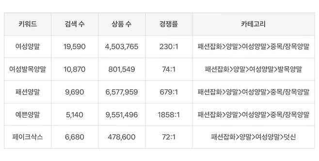 키워드 분석 결과를 바탕으로 제품을 소싱할 때 정답은 없어요. 베테랑 사장님은 50:1과 같이 일정 수준의 경쟁률을 기준선으로 삼는 등의 노하우를 가지고 있는데요. 쇼핑몰 규모, 판매 품목, 광고 예산에 따라 기준이 완전 달라질 수 있어요.