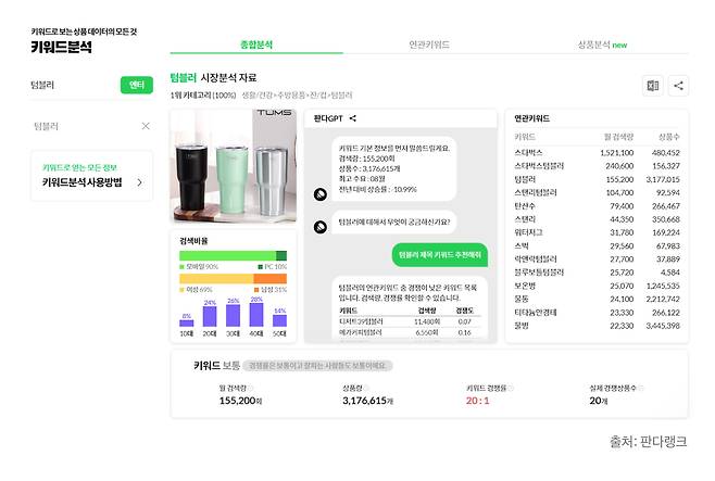 판다랭크는 키워드를 검색하면 키워드 경쟁률, 검색 매체와 성별 비율, 연관 키워드 등의 정보를 제공해요. 이외에도 스마트스토어 및 오픈마켓 등에 업로드된 동종 상품의 평균 가격을 확인할 수 있어요.
