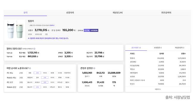 사장님닷컴에서는 메인 및 연관 키워드에 대한 네이버 키워드 광고 예상 집행비용 데이터도 제공해요. PC와 모바일에서의 예상 평균 클릭 비용을 체크하고 광고 효율을 미리 가늠해 볼 수 있어요. 뿐만 아니라 키워드 검색 매체별 노출 순서, 상품 관련 콘텐츠 발행량등에 대한 정보 확인이 가능해요.