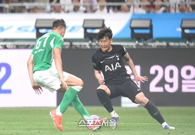 토트넘 손흥민이 3일 서울 월드컵경기장에서 열린 2025 쿠팡플레이 시리즈 뉴캐슬과 경기에서 드리블을 하고 있다.