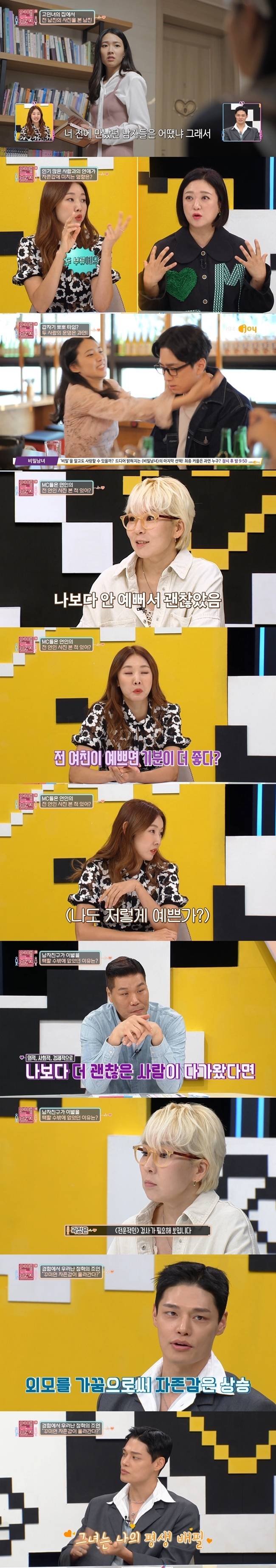 애인의 전 애인 사진을 봤던 경험도 털어놨다. 곽정은은 "대학교 때 있다. 나보다 안 예뻐서 괜찮았다. 재밌는 건 나랑 헤어지고 걔랑 결혼했다"고 웃었다.