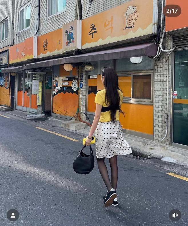 여기에 도트 패턴의 새틴 스커트를 매치해 걸리시한 무드를 더했습니다. 블랙과 옐로우의 강렬한 대비, 브라탑의 개성, 그리고 스커트의 러블리한 감각이 조화를 이루며 ‘효민표 Y2K 패션’이 완성된 셈이죠.