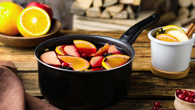 여기에 시나몬 스틱, 정향, 꿀 또는 설탕을 더하면 기본 재료 준비는 끝입니다. 중 약불에서 서서히 끓이다가 알코올이 날아가면 과일의 향과 단맛이 스며든 부드러운 향이 퍼집니다.