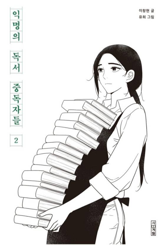 지적 토론과 망상이 뒤섞이고, 책 속의 책들이 이야기를 늘어놓을수록 <익명의 독서 중독자들>은 보르헤스의 미로처럼 끝없이 뻗어나간다. 로렌스가 쓴 엉망진창 소설들, 독서 클럽 회원들이 만든 괴상한 셰익스피어 공연, 그리고 그들이 겪는 첩보 스릴러 같은 상황들이 겹치면서 이야기는 혼성성과 혼종성을 띤다. 꼬리에 꼬리를 무는 상상력, 하나의 책이 거기서 끝나지 않고 또 다른 책으로 이어진다는 것, 이것이야말로 탐독가들의 이상이 아닐까. 그러하기에 오늘도 독서 중독자들은 책을 모은다. 책장에는 읽은 책보다 읽지 않은 책이 많고, 집 안의 대부분을 책장이 차지하더라도 말이다. 이 만화는 그런 적독가(積讀家)에게 바치는 헌사이기도 하다. 다음 웹툰으로 연재한 이 작품이 종이책이 되었을 때 더 어울리는 듯 보이는 이유도 여기에 있다. 다만 2권은 컬러에서 흑백으로 바뀌었고 볼륨이 줄었다는 점이 독서의 위기를 다른 면으로 보여준다.