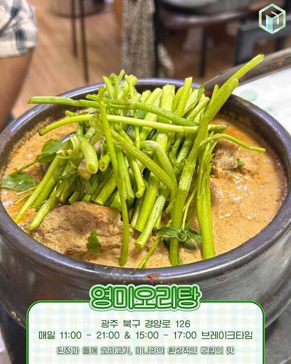 고기는 적당히 부드러운데다가 국물에서 깊은 맛이 느껴져 진국을 맛보실 수 있습니다. 영미오리탕의 국물에서 들깨와 땅콩의 고소함이 진하고 걸쭉하게 느껴지고, 초장과 미나리가 입 안을 상쾌하게 해주어 첫입부터 마지막 입까지 완벽히 만족하고 드실 수 있는 광주 맛집으로 추천드립니다.