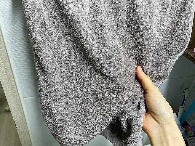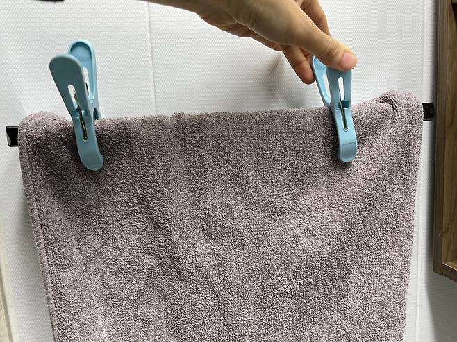 이렇게 수건을 길게 빼서 빨래집게로 고정시키면 더 넓은 면적을 활용할 수 있습니다.