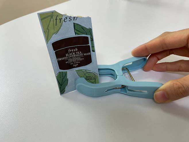화장품 샘플은 한번 쓰기에는 양이 많아서 뜯고 나면 보관이 애매한데요. 이때, 빨래집게를 활용하면 쓰던 샘플은 보관하기 편합니다.