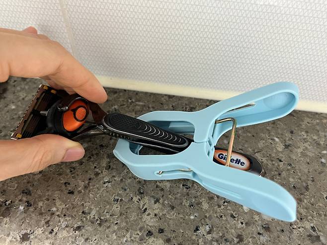 이럴 때 빨래집게 구멍 사이에 면도기를 넣어서 보관해 보세요. 면도날 부분이 바닥과 닿지 않아 좀 더 위생적으로 보관할 수 있습니다.