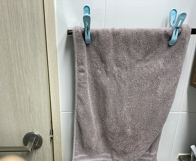 수건을 걸어놓고 쓰다 보면 항상 앞쪽 부분만 사용하게 되어 축축해지는데요. 이때 빨래집게 2개만 있으면 수건을 효율적으로 사용할 수 있습니다.