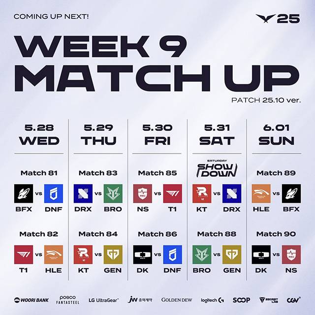 라이엇 게임즈가 개발 및 서비스하는 '리그 오브 레전드(LoL)'의 이스포츠 한국 프로 리그인 LCK를 주최하는 리그 오브 레전드 챔피언스 코리아(이하 'LCK')는 28일(수)부터 6월 1일(일)까지 서울시 종로구 롤파크에 위치한 LCK 아레나에서 2025 LCK 정규 시즌 9주 차가 진행된다고 밝혔다.