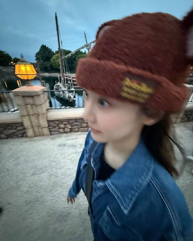 특히 눈길을 끈 건 머리에 쓴 털모자다. 곰돌이 귀처럼 살짝 솟은 디테일과 따뜻한 텍스처가 러블리한 분위기를 더하며, 마치 디즈니 한 장면에서 튀어나온 듯한 동화적인 무드를 완성한다. 귀여운 무드를 강조한 동시에 전체 룩은 데님 셋업으로 날카롭게 잡아 시선을 균형 있게 사로잡는다.