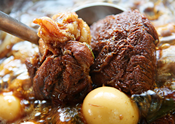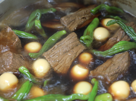 ▶ 준비한 육수에 간장, 국간장, 설탕, 매실청을 넣어 양념장을 만든 뒤 고기와 삶은 달걀을 넣어 약불에서 은근히 졸입니다.