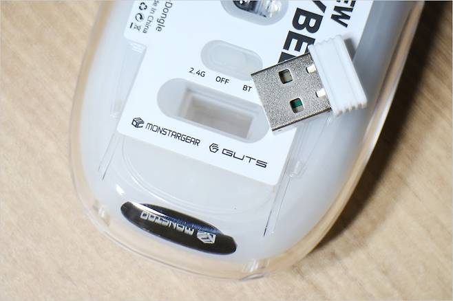 후면부에 2.4G 초고속 연결 동글이 꼽혀 있습니다. 분리 후 노트북이나 데스크탑 등에 연결해 사용할 수 있습니다. 그리고 2.4G / OFF / BT 연결 항목을 확인할 수 있습니다.