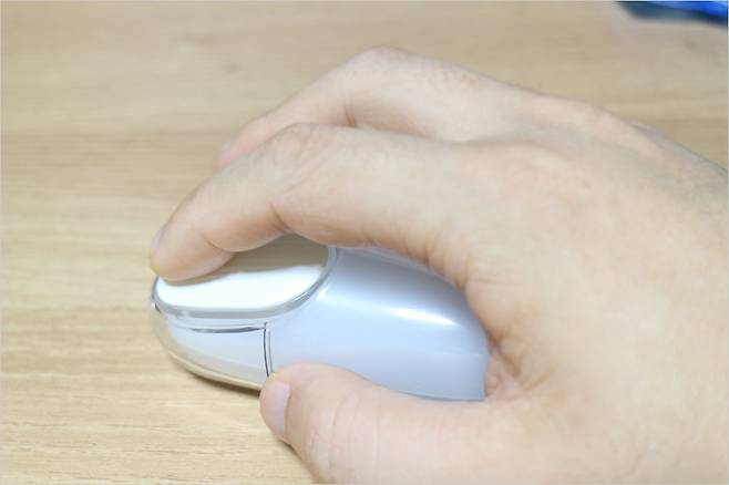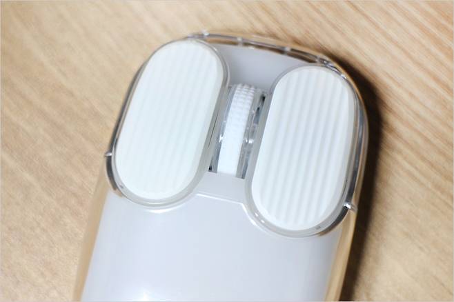 클릭감은 부드러우면서도 소음은 저소음 마우스인 만큼 상당히 조용한 편입니다. 팅팅 거리는 딸깍 거리거나 울림 현상 같은것이 없습니다. 그리고 좌우 버튼 면적이 넓어서 손 크기에 따라서도 최적화에서 사용할 수 있다는 점이 장점같습니다.