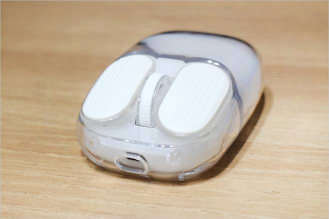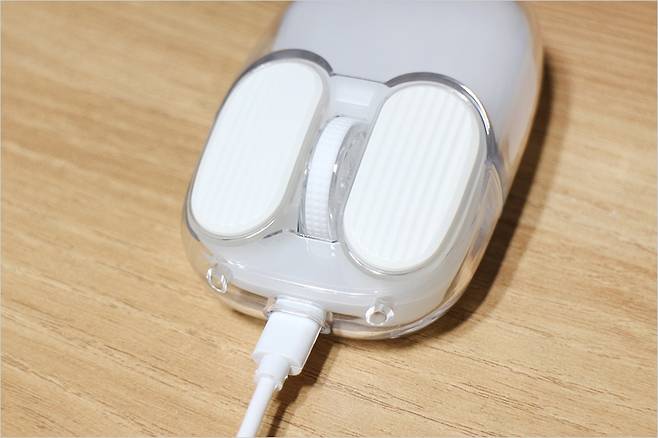 우선 디자인이 정말 독특한데요. 미끄러지지 않도록 하는 좌우 클릭 버튼 및 벌 모양의 느낌의 디자인입니다. 그리고 휠은 길어서 직관적으로 바로 조작이 가능한 구조입니다. 전면에는 Type-C 타입 단자를 확인 할 수 있습니다. 좌측 좌우 버튼은 존재하지 않으며 설계상 딱 필요한 부분만 있는 느낌입니다.
