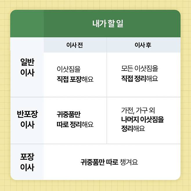 일반적으로 고객과 업체의 업무 구분에 따라 일반이사, 반포장이사, 포장이사로 구분해요.