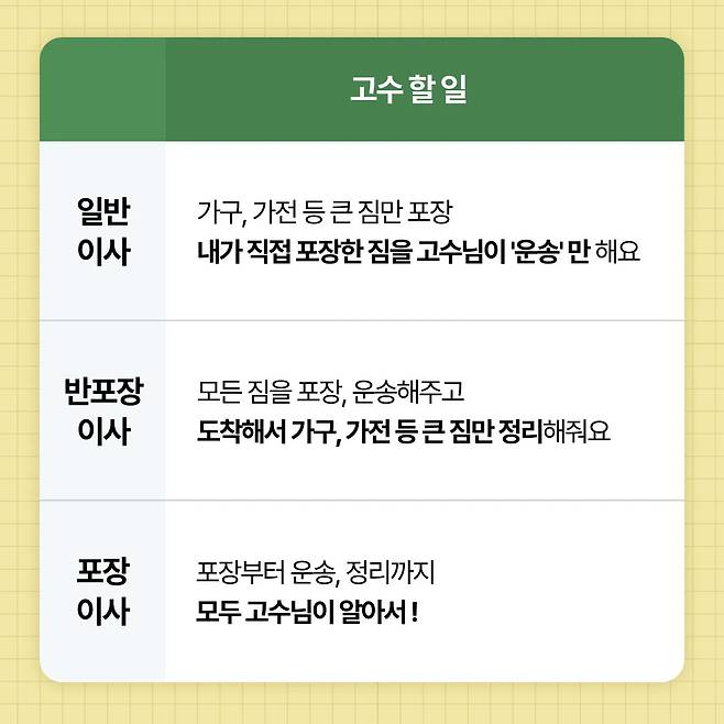 일반, 반포장, 포장이사는 업체가 책임지는 일의 양에 따라 구분되는 것이다 보니 비용도 다른데요.