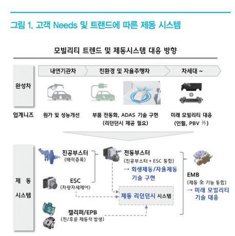 자동차 산업의 잘 알려진 메가 트렌드로부터 제동 시스템에 요구되는 특성을 M.E.C.A 용어 중심으로 살펴보면 다음과 같다.