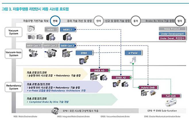 모비스는 시장의 트렌드 기반 기술 수요를 예측하고 리 던던시 전략을 바탕으로 미래 제동 선행기술을 개발 중에 있다. 현재는 <그림 3>과 같이 자율주행 기반기술을 확보하였고, 이를 종래 기술 개선과 융합을 통하여 단기적으로는 iMEB AD(iMEB+MEB) 시스템으로 리던던시를 확보하였다. 중장기적으로는 ERBB AD(ERBB+MEB) 시스템을 개발하여 자율주행 차량 적용 및 리던던시를 확보할 예정이다.