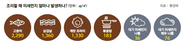 환경부에서 정리한 자료에 따르면, 요리하는 동안에는 대기 미세먼지가 나쁨일 경우보다 더한 미세먼지가 발생한다고 합니다. 특히나 굽기 요리를 할 때에는 미세먼지 매우 나쁨 수준보다 10배 이상의 미세먼지가 공기 중을 배회하게 된다고 하는데요.