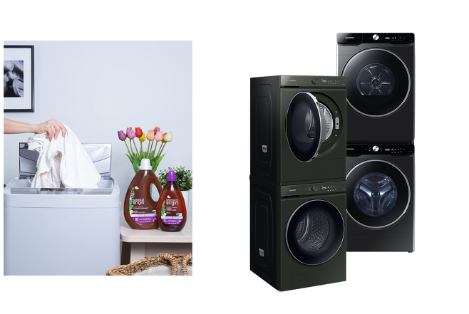 또한 요즘은 건조기와 함께 위 이미지처럼 직렬 배치하는 경우도 많은데요. 일체형이라면 상관없지만 따로 구비했을 경우에는 반드시 전용 설치 키트를 사용하거나 별도 선반을 이용해야 합니다.