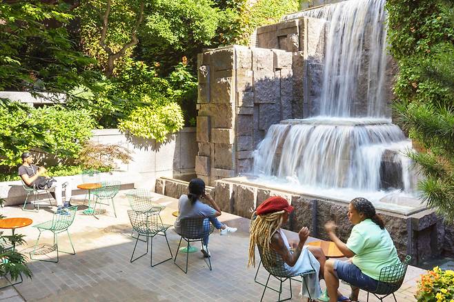'그린에이커 공원(Greenacre Park)'은 조용한 거리의 두 건물 사이에 자리 잡은 작고 도시적인 공원입니다.