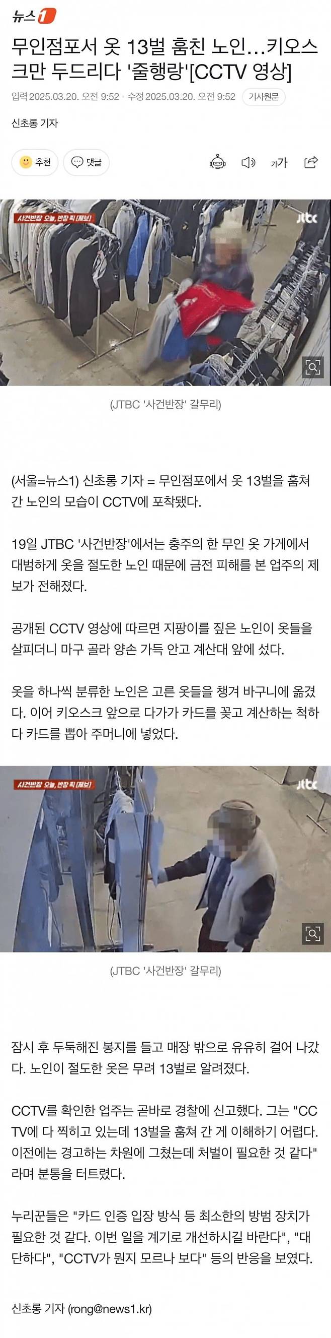 무인점포서 옷 13벌 훔친 노인…키오스크만 두드리다 '줄행랑'