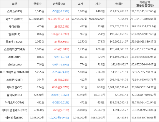 또한, 플로우(8.56%, 1,065원), 세이(7.53%, 400원), 스테픈(6.78%, 394원), 스토리지(5.88%, 1,080원), 시아코인(4.67%, 8.74원), 이더리움클래식(2.81%, 27,850원)이 상승세를 나타냈다.