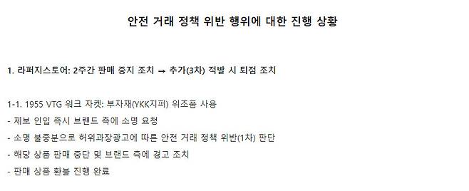 부정적인 시각도 이유가 있어요. 이번 패딩 충전재 혼용률 이슈는 여러 언론에서 내용을 다뤘기에 널리 알려졌지만, 라퍼지스토어는 이미 몇 개월 전에도 부자재 관련 이슈가 있었거든요. 무신사 뉴스룸에 따르면 해당 행위에 대해서는 1차 경고를 진행한 것으로 보여요.