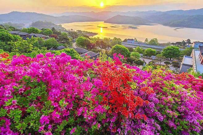 봄이 되면 신록과 꽃들이 호숫가를 물들이고, 잔잔한 물결 위로 반사된 하늘과 나무들이 그림처럼 펼쳐진다.