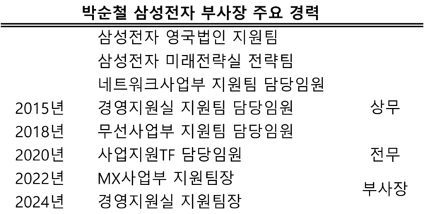 박 부사장은 사업부와 국외법인, 컨트롤타워를 두루 경험한 재무통으로 평가된다. 1966년생으로 연세대를 졸업했다. 삼성전자 영국법인 지원팀, 미래전략실 전략팀을 거쳐 네트워크사업부, 무선사업부 등 사업부 소속 지원팀에서도 일했다. 전무로 승진한 2020년부터 2년간 사업지원TF에 소속됐고, 2022년부터 지난해까지는 부사장으로 모바일경험(MX)사업부 지원팀장을 맡았다. 이후 최근까지는 경영지원실 소속으로 지원팀장을 맡아왔다.