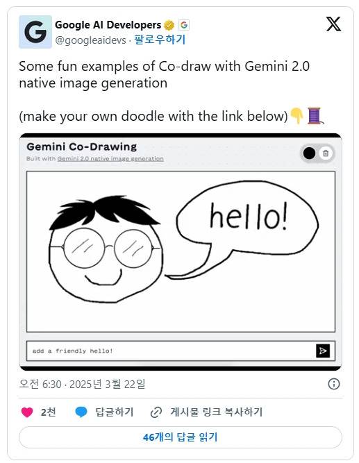 구글 AI 개발자팀(Google AI Developers)이 제미나이 2.0(Gemini 2.0)의 네이티브 이미지 생성 기능을 활용한 ‘코-드로우(Co-draw)’ 기능의 다양한 사례를 소셜 미디어를 통해 공개했다. 이 기능은 사용자의 간단한 낙서를 인공지능이 완성된 이미지로 변환해주는 서비스다. 구글 AI 개발자팀은 22일(현지 시간) 공식 X를 통해 “몇 개의 선에서 많은 것으로 변환할 수 있습니다”라는 설명과 함께 알렉산더 첸(Alexander Chen)의 작품을 소개했다.