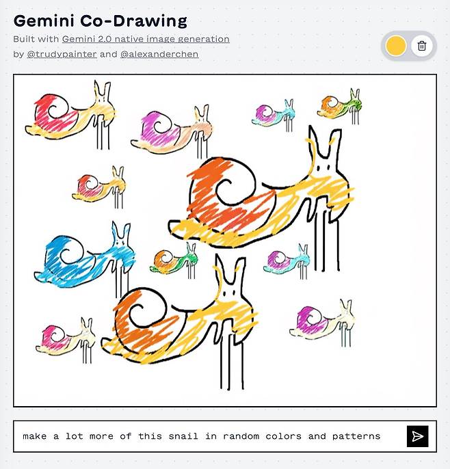 구글 AI 개발자팀(Google AI Developers)이 제미나이 2.0(Gemini 2.0)의 네이티브 이미지 생성 기능을 활용한 ‘코-드로우(Co-draw)’ 기능의 다양한 사례를 소셜 미디어를 통해 공개했다. 이 기능은 사용자의 간단한 낙서를 인공지능이 완성된 이미지로 변환해주는 서비스다. 구글 AI 개발자팀은 22일(현지 시간) 공식 X를 통해 “몇 개의 선에서 많은 것으로 변환할 수 있습니다”라는 설명과 함께 알렉산더 첸(Alexander Chen)의 작품을 소개했다.