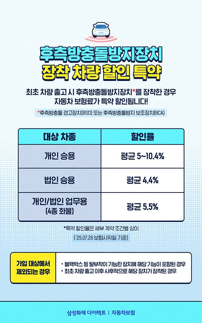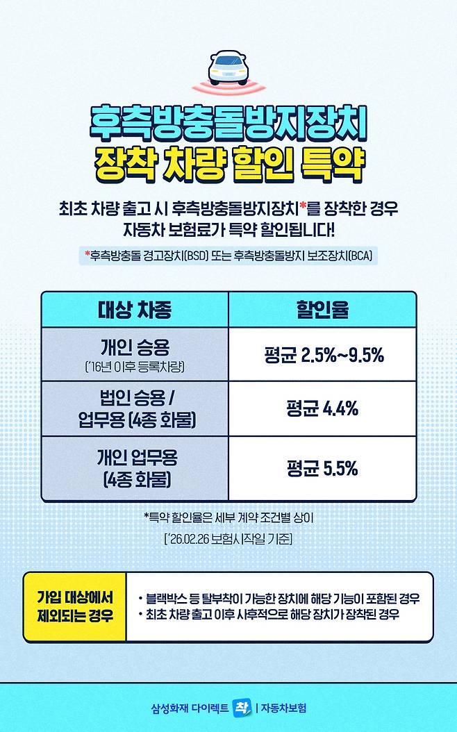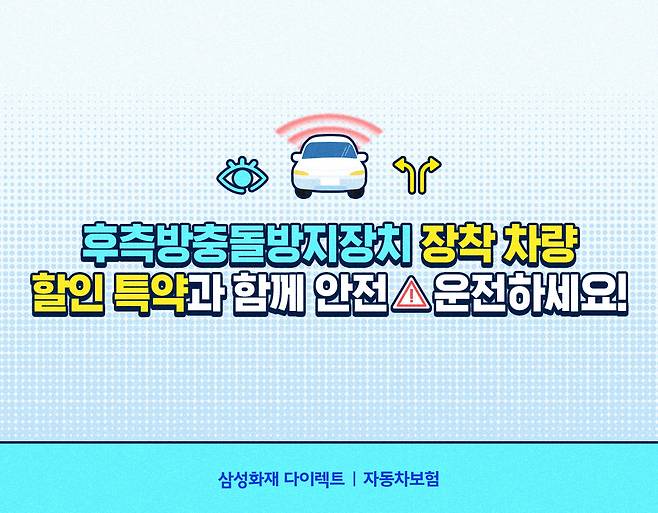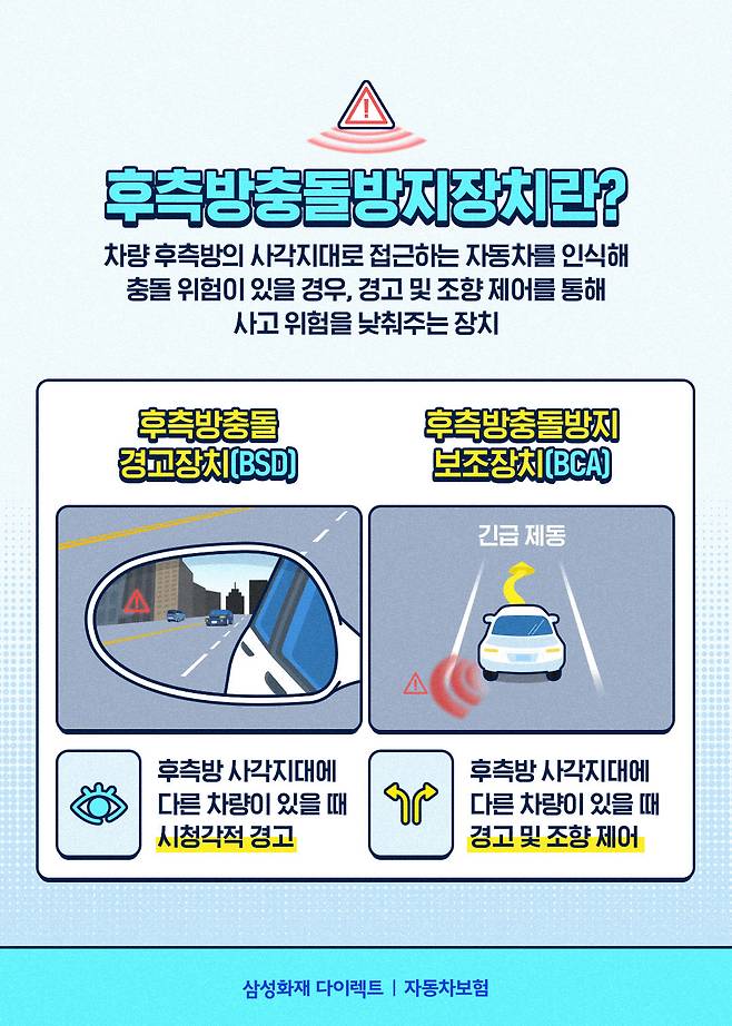 삼성화재 다이렉트의 ‘후측방충돌방지장치 장착 차량 할인 특약’과 함께 안전운전하세요.