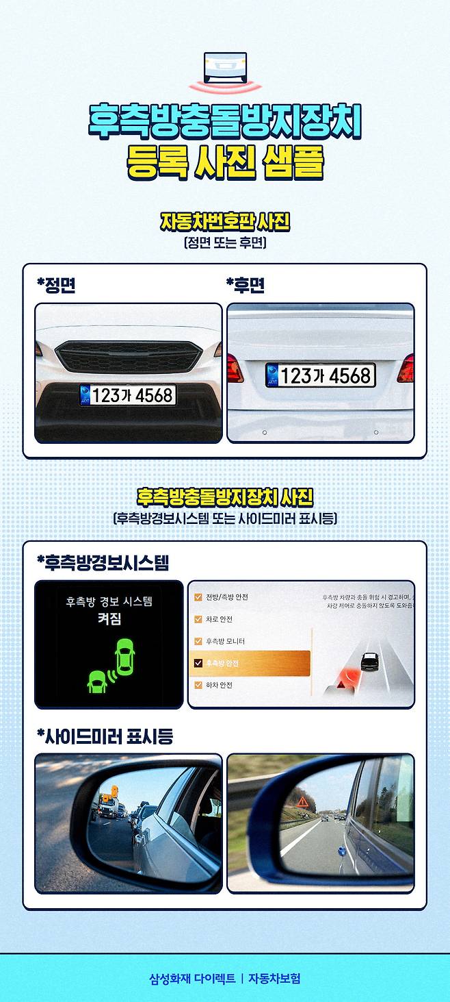 그렇다면 가입은 어떻게 하면 될까요? 가입 시 후측방충돌방지장치 장착 여부를 선택, 현재 장착 중인 장치의 정보를 선택하면 됩니다. 이후 번호판 사진 1장과 후측방충돌방지장치 장착 사진 1장을 제출하면 되는데요. 차량 기본 옵션으로 장치가 장착되어 있다면 사진을 등록하실 필요는 없습니다. 또한 사진이 준비되지 않은 경우라면 후측방충돌방지장치 할인 특약을 제외하고 가입을 진행, 추후 고객센터를 통해 추가로 가입할 수 있으니 걱정 마세요!