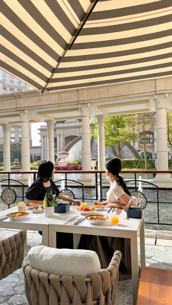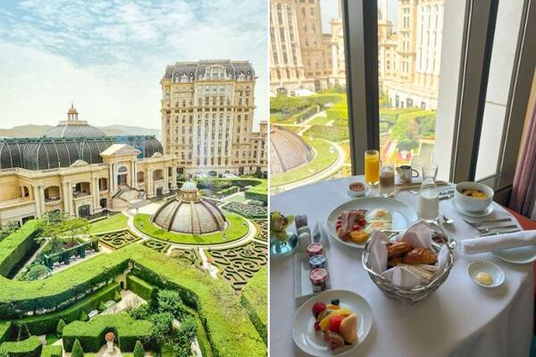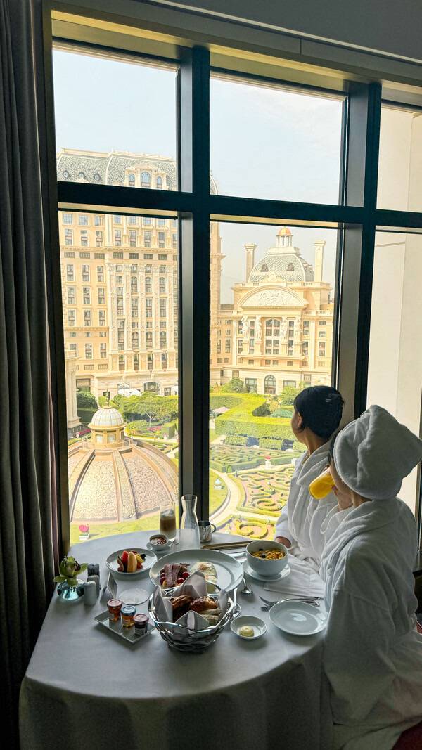 수영 후 마지막 날 아침으로 그랜드 리스보아 팰리스 마카오 호텔의 정원을 바라보며 즐기는 룸서비스는 여행의 마무리하기 최고의 선택 중 하나입니다.