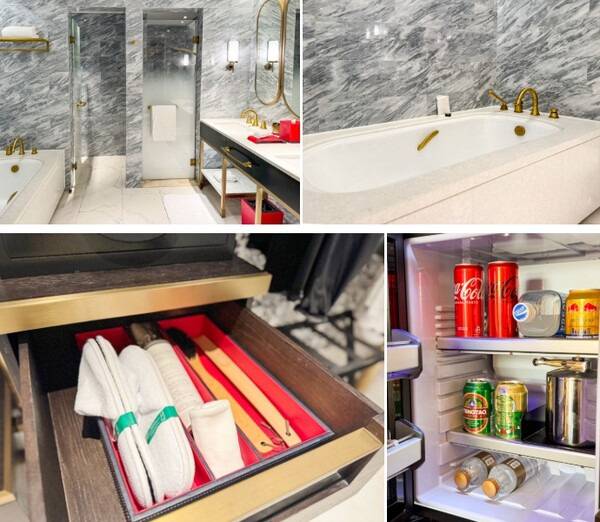 또 넓은 욕실은 샤워실과 화장실이 분리되어 있으며, 2개의 세면대가 있어 편의성을 높습니다. 욕조도 마련되어 있어 여독을 풀기에 충분하고 다리미, 각종 세안용품은 물론 커피포트와 커피 머신, 다양한 음료도 잘 갖춰져 있습니다.