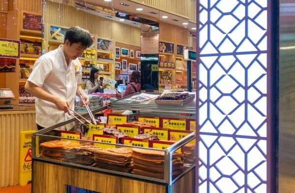 성당을 나와 조금 더 걸으면 고소하고 짭잘한 냄새가 풍겨오는 육포거리(러우강거리)에 도착합니다. 다양한 육포와 마카오식 간식, 말린 과일 등을 시식하며 고를 수 있는 거리로, 간단한 쇼핑을 즐기기에도 딱 좋은 곳이에요.