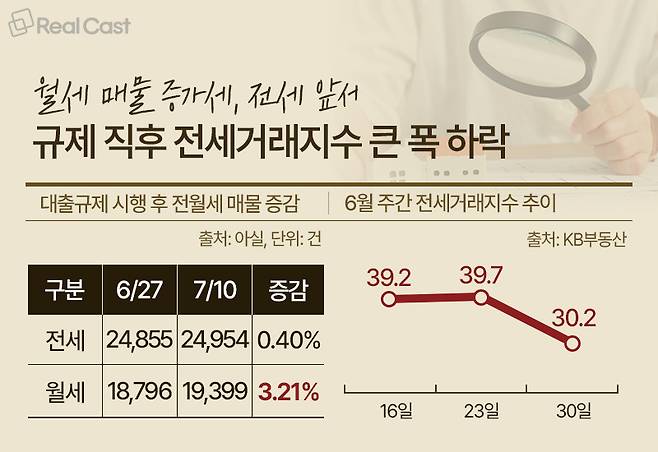 부동산 빅데이터 아실에 따르면 규제 발표일인 규제 발표 직후인 6월 27일부터 7월 10일까지 서울 아파트 전세 물량은 2만 4,855건에서 2만 4,954건으로 0.4% 증가한 반면, 같은 기간 월세 물량은 1만 8,796건에서 1만 9,399건으로 3.2% 증가했습니다.