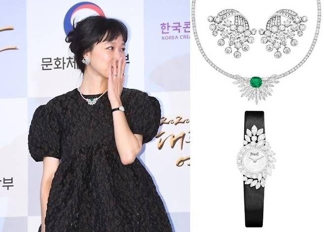 공효진은 여기에 3.41캐럿 상당의 다이아몬드와 블랙 새틴 스트랩의 손목시계도 착용해 럭셔리한 룩을 완성했다.