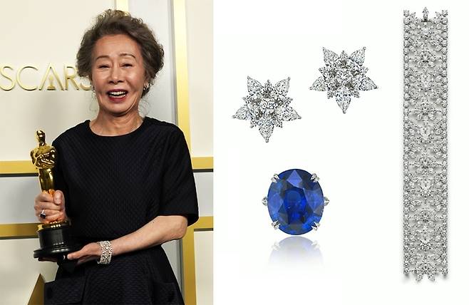 윤여정 역시 오스카 시상식에서 고가의 다이아몬드 팔찌와 사파이어링을 선보여 시선을 압도했다.