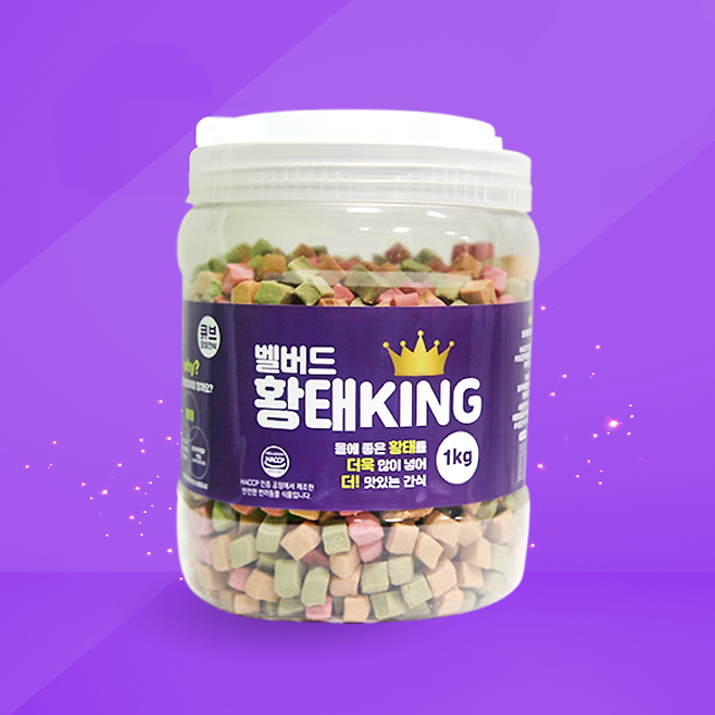 1kg 대용량 강아지 트릿이에요. 황태와 함께 오리, 블루베리, 닭고기, 당근 등이 들어갔습니다. 1cm x 0.7cm의 부담 없는 작은 사이즈의 트릿으로 훈련 시 활용하기 아주 좋아요.