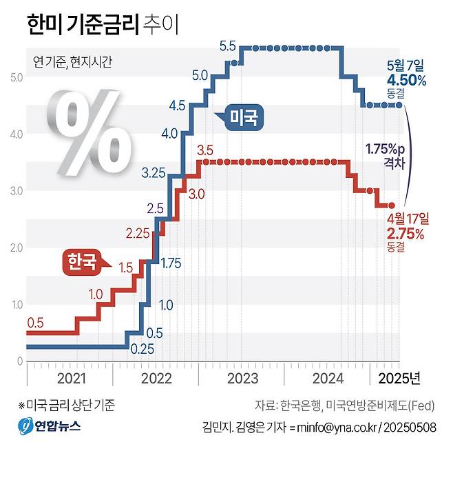 박 이코노미스트는 "이번에 한은이 금리를 내리면 미국(4.25∼4.50%)과 격차가 2.00%p까지 커지는 것은 부담"이라면서도 "길게 보면 연준도 인하 기조에 있는 만큼 일시적 확대를 한은이 받아들일 것"이라고 예상했다.