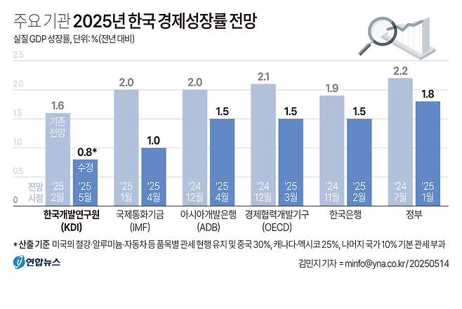 실제로 이달 들어서만 현대경제연구원이 올해 전망치를 1.7%에서 0.7%로 무려 1.0%p나 한꺼번에 깎았고, 국책 연구기관인 한국개발연구원(KDI)의 예상 성장률마저 1.6%에서 0.8%로 반토막이 났다. 8개 해외 주요 투자은행(IB)이 제시한 올해 한국 성장률 전망치 평균도 4월 말 기준 0.8%에 불과하다.