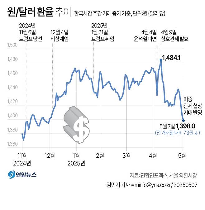 원/달러 환율은 앞서 지난달 9일 미국 상호관세 발효와 함께 주간(낮) 거래에서 금융위기 이후 가장 높은 1,487.6원까지 치솟았지만, 이후 미국 관세정책 불확실성과 재정 적자 확대 우려 등으로 달러 가치가 급격히 약세를 보이면서 지난 23일엔 6개월여만에 최저 수준인 1.375.6원까지 떨어졌다.